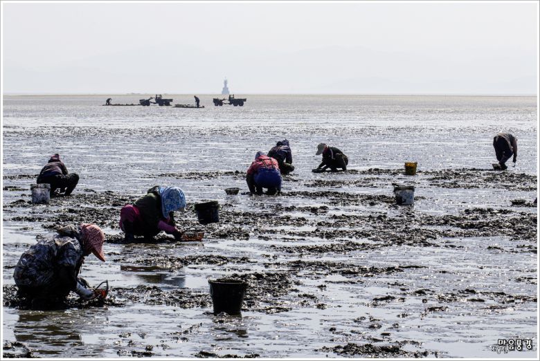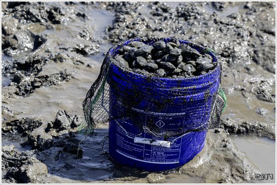 쉴 틈 없는 손길 까만 바지락을 캔다.