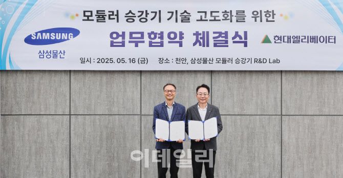 현대엘리베이터는 16일 삼성물산과 충남 천안 삼성물산 모듈러 승강기 R&D LAB에서 ‘모듈러 승강기 기술 고도화를 위한 업무협약(MOU)’을 체결했다. 협약식에는 이태원 현대엘리베이터 CTO(전무)와 조인수 삼성물산 건설부문 M&E 본부장(상무) 등 양측 관계자들이 참석했다.