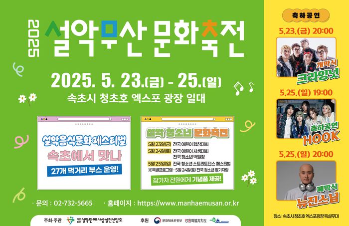 [스포츠서울ㅣ김기원기자]2025 설악무산문화축전이 오는 5월 23일부터 25일까지 3일간 속초시 청초호 엑스포 광장 일원에서 개최된다.