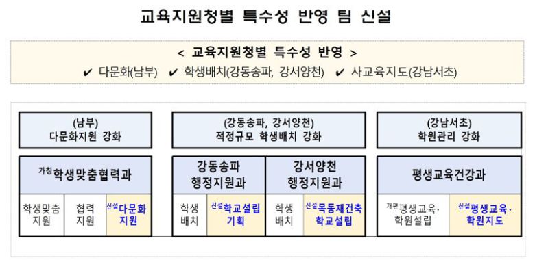 특히 남부교육지원청에는 다문화지원팀, 강동송파교육지원청과 강서양천교육지원청에는 학교설립팀, 강남서초교육지원청에는 학원관리팀을 신설한다.