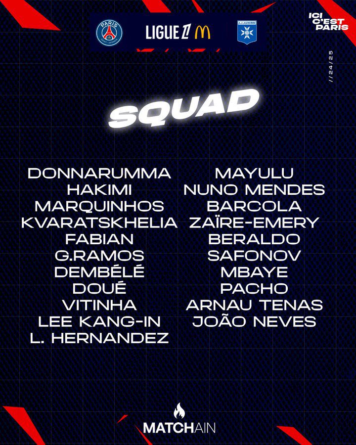 PSG는 이날 경기에서 4-3-3 포메이션을 들고 나왔다. 잔루이지 돈나룸마가 골문을 지킨 채, 누누 멘데스, 루카스 베라우도, 마르퀴뇨스, 아크라프 하키미가 최종 수비라인을 구성했다. 미드필더에는 파비안 루이스, 비티냐, 주앙 네베스가 출전했고 최전방 스리톱에는 브래들리 바르콜라, 우스망 뎀벨레, 흐비차 크바라츠헬리아가 상대 골문을 노렸다. 거의 최정예 멤버들이 다가오는 프랑스컵과 UEFA 챔피언스리그 등 두 경기 결승 리허설을 연달아 치르듯이 출격했다.