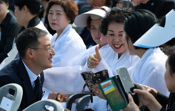 민주당 입당을 선언한 김상욱 의원이 18일 광주광역시 북구 국립 5·18민주묘지에서 열린 5·18민주화운동 45주년 기념식에서 오월어머니집유가족들과 인사하고 있다. [사진=연합뉴스] |