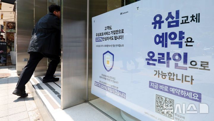 [서울=뉴시스] 추상철 기자 = 12일 오후 서울 시내 T월드 매장 앞에 유심 교체 및 유심보호서비스 안내문이 게시돼 있다. SK텔레콤은 이날부터 유심 정보 일부를 변경하는 ‘유심 재설정’(유심 포맷) 솔루션을 도입했다. 2025.05.12. scchoo@newsis.com