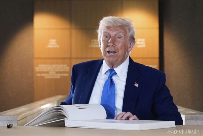[아부다비(아랍에미리트)=AP/뉴시스]도널드 트럼프 미 대통령이 16일 아랍에미리트(UAE) 아부다비의 있는 아브라함 가옥을 둘러본 뒤 방명록에 서명하고 있다. 그는 이날 집권 2기 핵심 목표 중 하나인 이란과의 핵협상이 임박했다고 밝혔다고 뉴욕 타임스(NYT)가 보도했다. 2025.05.16. /사진=유세진 |