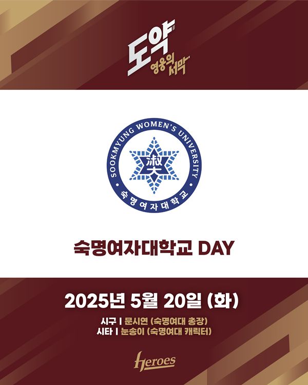[스포츠투데이 신서영 기자] 키움 히어로즈가 오는 20일 서울 고척스카이돔에서 열리는 삼성 라이온즈와 경기에 '숙명여자대학교데이' 행사를 진행한다고 18일 밝혔다.