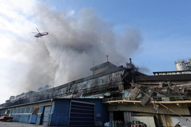 금호타이어 광주공장 화재 발생 이틀째인 18일 소방 헬기가 상공을 돌며 불을 끄고 있다. [사진=연합뉴스]