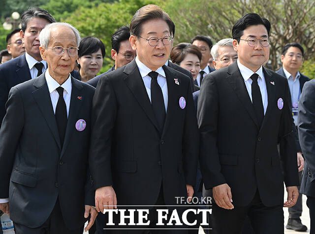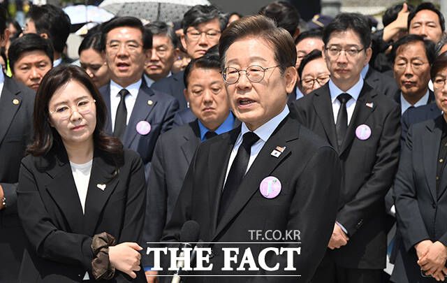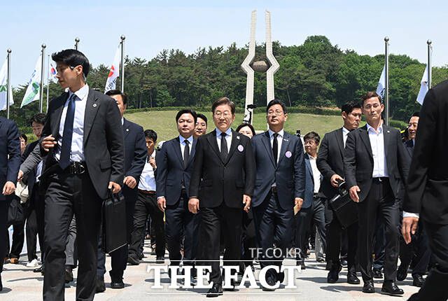 이재명 더불어민주당 대선 후보(가운데)가 18일 광주 북구 국립5·18민주묘지에서 열린 '제45주기 5·18 민주화운동기념식'에 참석하고 있다. /광주=국회사진취재단 |