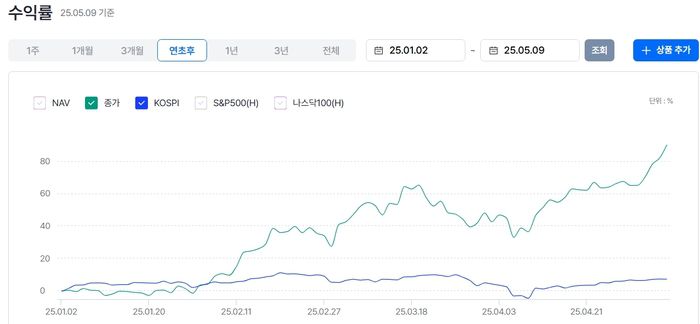 2025년 들어 5월 9일 까지 TIGER K방산&우주 ETF (녹색선)가 코스피 대비 월등하게 높은 수익률을 보이고 있다. <자료=펀ETF>