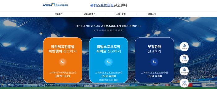 ‘불법스포츠토토 신고센터’에서는 불법스포츠도박 사이트 운영자 및 이용자, 사이트 주소 등 관련 정보를 신고하면 포상금을 지급하는 제도를 시행 중이다. 신고는 불법스포츠토토 신고센터 홈페이지 또는 전화(1899-1119)를 통해 가능하다.