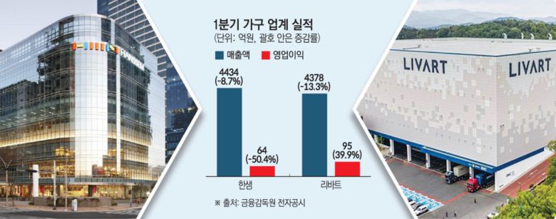 가구 업계 선두 자리를 두고 한샘과 리바트의 경쟁이 치열하다. 건설 경기 불황으로 인한 매출 감소는 공동 과제로 지목된다.