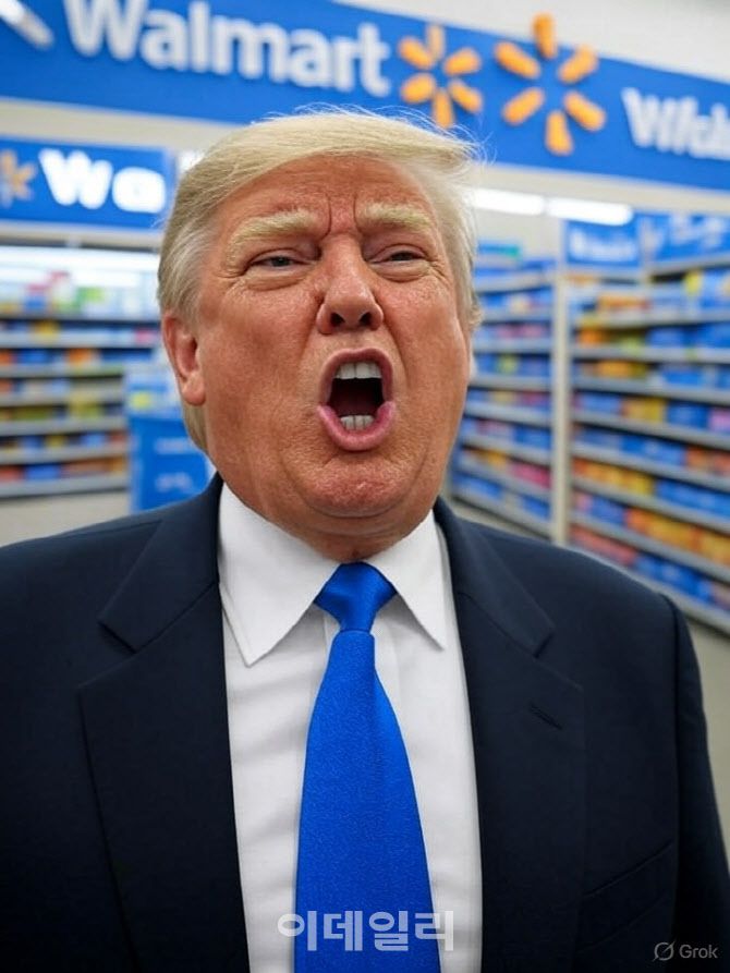생성형 AI 그록3로 만든 가상의 이미지로 도널드 트럼프 미국 대통령이 관세로 인한 가격 인상을 예고한 미국 대형 소매업체 월마트 매장 안에서 고함을 치고 있다.(사진=그록3)