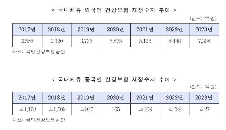 다만 건보공단에 따르면 국내 체류 중국인의 건강보험 재정수지는 외국인 지역가입자 강제가입 제도 도입과 피부양자 요건 강화(6개월 이상 체류) 등에 따라 2020년 이후 적자폭이 감소세를 그리는 중이다. 2023년 기준 27억원 적자를 기록했다. 전체 국내 체류 외국인 또한 지속적으로 흑자를 기록해 2023년 7308억 흑자를 냈다.