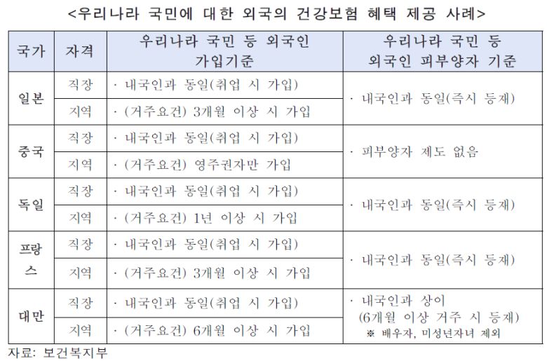 해외 주요국도 직장 가입자의 경우 대부분 내국인과 동일하게 취업 시 가입되도록 하고 있다. 지역가입자는 거주기간이나 영주권 등을 요건으로 한다. 다만 피부양자 자격의 경우 중국은 관련 제도가 없고, 대만은 6개월 이상 거주요건 등을 기준으로 두고 있다. 건강보험 피부양자는 직장가입자의 생계를 의존하는 사람으로 소득 없이 건강보험 혜택을 받을 수 있는 사람을 말한다.