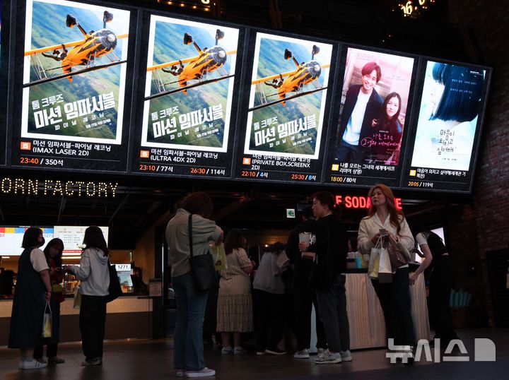 [서울=뉴시스] 김금보 기자 = 18일 서울 시내 한 영화관에 영화 '미션 임파서블:파이널 레코닝' 홍보물이 붙어있다.18일 영화진흥위원회 통합전산망에 따르면, 전날 개봉한 '미션 임파서블: 파이널 레코닝'은 개봉 첫날에만 관객 42만3945명을 기록했다. 2025.05.18. kgb@newsis.com |