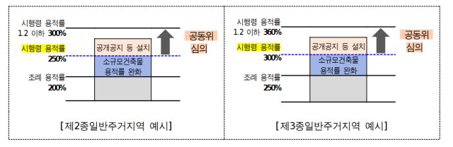 이에 따라 소규모 건축물 용적률을 제2종지역은 200%에서 250%로, 제3종지역은 250%에서 300%로 각각 법적 상한까지 한시적으로 완화한다. 2028년 5월 18일까지 3년간 적용된다.