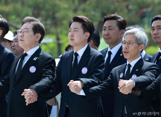 이재명·이준석·권영국 나란히…손 맞잡고 추모곡 제창