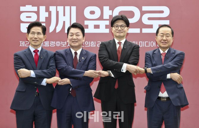 [이데일리 노진환 기자] (왼쪽부터)김문수 국민의힘 대통령 선거 후보, 안철수 중앙선거대책위원회 공동선대위원장, 한동훈 전 국민의힘 대표, 홍준표 전 대구시장.