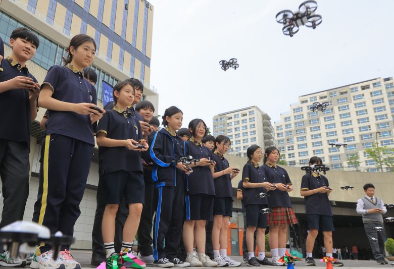 지난 14일 서울 강서구 마곡동 코엑스 마곡에서 열린 드론산업 얼라이언스 창립총회에서 학생들이 드론비행 체험을 하고 있다. [연합]