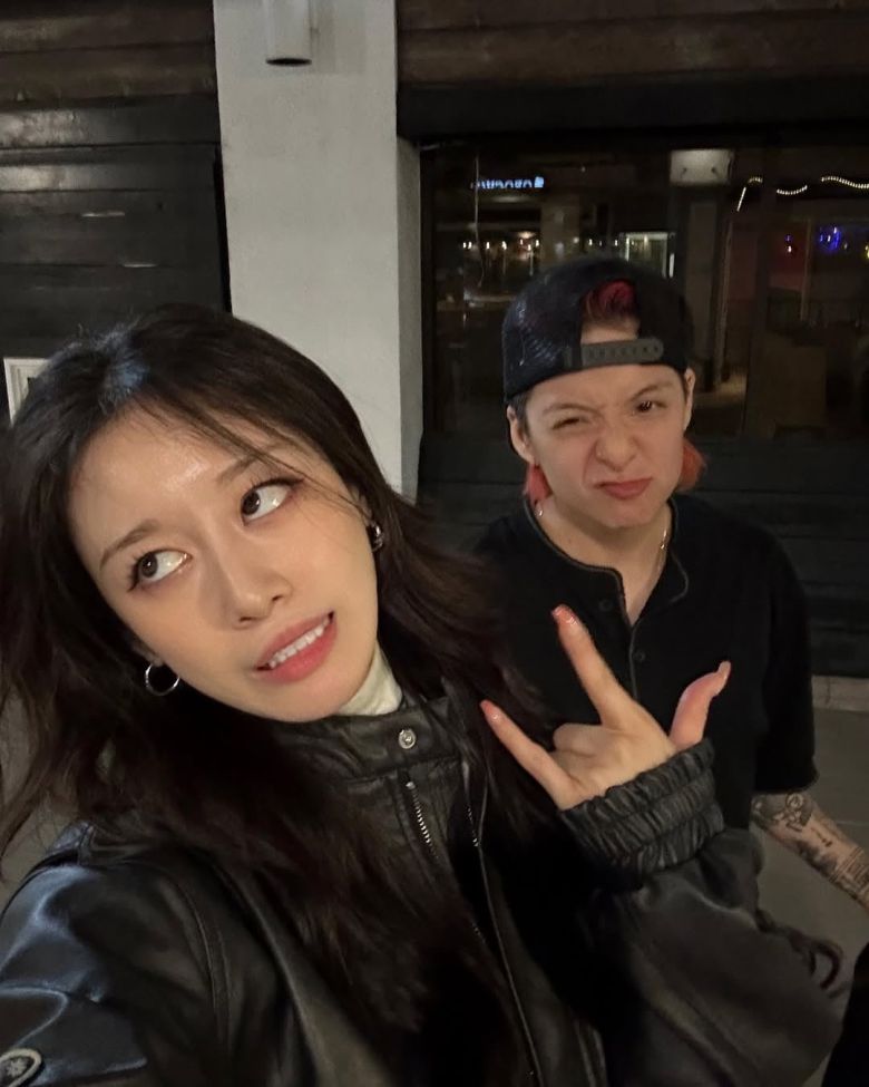 사진 속에는 지연과 엠버의 모습이 보인다. 지연의 브이 포즈를 엠버는 만세 포즈를 취하고 있다. 지연의 힙한 분위기와 엠버의 온 팔에 새겨진 문신이 눈길을 끈다. 또 다른 사진에서 두 사람은 익살스러운 표정으로 장난기 가득한 모습을 보여준다. 돈독한 두 사람의 모습이 미소를 유발한다.