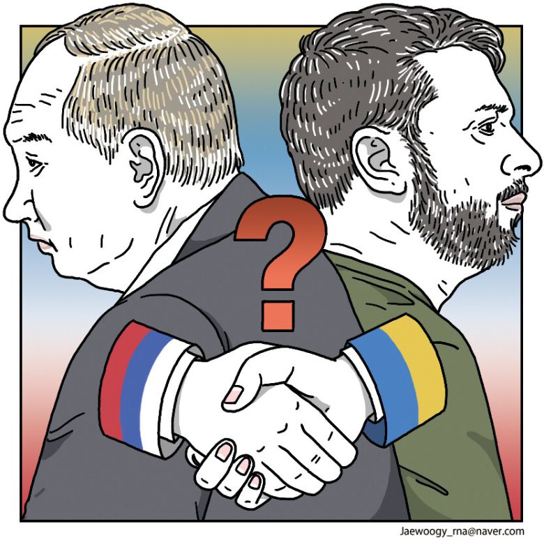 러시아와 우크라이나가 전쟁 이후 3년2개월 만에 직접 마주 앉은 이스탄불 회담을 두고 개최 직전까지 다양한 회의론이 불거져 나왔다. 러시아 정상도, 우크라이나 정상도, 몇달 동안 중재해온 미국 정상도 불참했고, 알려진 시간보다 서너시간 미뤄진 뒤 가까스로 열렸다. 하지만, 튀르키예 이스탄불 돌마바흐체 궁전에서 튀르키예 대표단을 중앙에 놓고 양국 대표단이 ‘ㄷ’자 형태로 마주 앉은 풍경은 그 자체로 파급력이 있었다. 오랜 기간 전쟁을 이어온 두 당사국의 고위급 인사들이 1시간30분가량 얼굴을 맞대고 앉았다는 것은 그렇게 평가절하할 만한 일은 아니다.