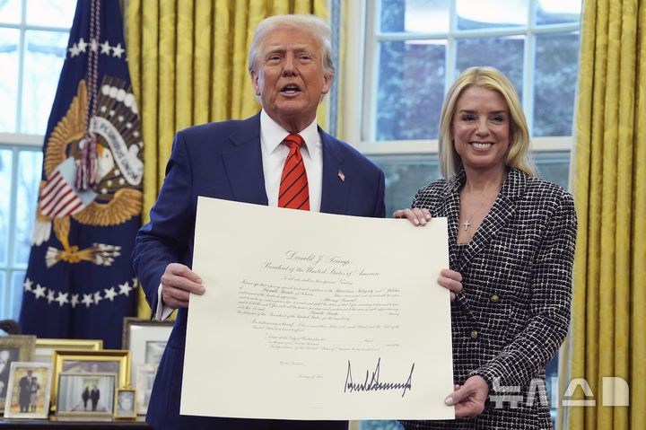 [워싱턴=AP/뉴시스]도널드 트럼프 행정부가 의원 등 공직자 기소 절차를 완화할 방침이라고 워싱턴포스트(WP)가 보도했다.WP는 17일(현지 시간) 익명의 소식통을 인용해 "전국 연방 검찰은 조만간 법무부 공직윤리부(Public Integrity Section) 승인 없이도 의회 의원을 기소할 수 있게 될 가능성이 있다"고 보도했다. 사진은 트럼프 대통령이 지난 2월5일(현지 시간) 백악관 집무실에서 팸 본디 신임 법무장관 임명식을 진행하는 모습. 2025.02.06. |
