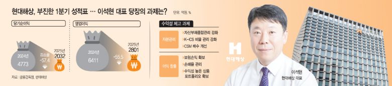 업계에서는 이익 창출 능력과 리스크 관리 역량을 높여야 한다고 보고 있다. 한 보험업계 관계자는 "올해 1분기 손해보험 업계는 산불 등 외부 요인이 보험손익에 영향을 많이 미쳤다"며 "현대해상의 경우 보험손익에서 낙폭이 커 연내 보험손익 확보를 위한 손해율 관리와 수익성 높은 상품 포트폴리오 개선, 지급여력비율 관리 등이 필요하다"고 지적했다.