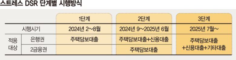 금융당국은 지난해 9월 2단계 스트레스 DSR을 도입하면서 은행권 주담대·신용대출 및 2금융권 주담대에 수도권 1.2%, 비수도권 0.75%의 스트레스 금리를 적용해왔다. 3단계 스트레스 DSR이 도입되면 은행권 및 2금융권의 주택담보대출과 신용대출, 기타대출 금리에 가산금리 100%(하한)인 1.5%가 적용된다.