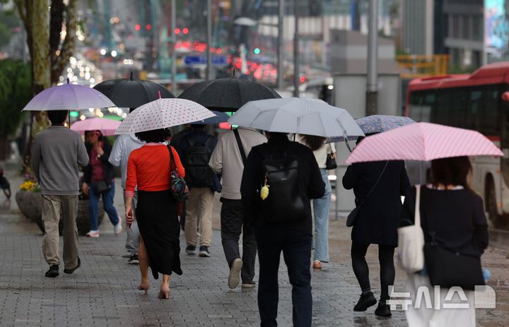 [서울=뉴시스] 김진아 기자 = 전국 대부분 지역에 비가 내리고 있는 16일 서울 강남구 일대에서 우산을 쓴 시민들이 퇴근길 발걸음을 재촉하고 있다. 2025.05.16. bluesoda@newsis.com |