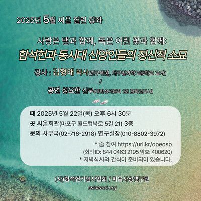 ◇ 함석헌기념사업회는 오는 22일 오후 6시30분 서울 마포구 씨알회관에서 5월 씨알 열린 강좌를 연다. 김형태 박사가 ‘사랑은 뱀과 함께, 독은 어린 꽃과 함께 - 함석헌과 동시대 신앙인들의 정신적 소묘’를 주제로 강의한다. 문의 (02)716-2918.