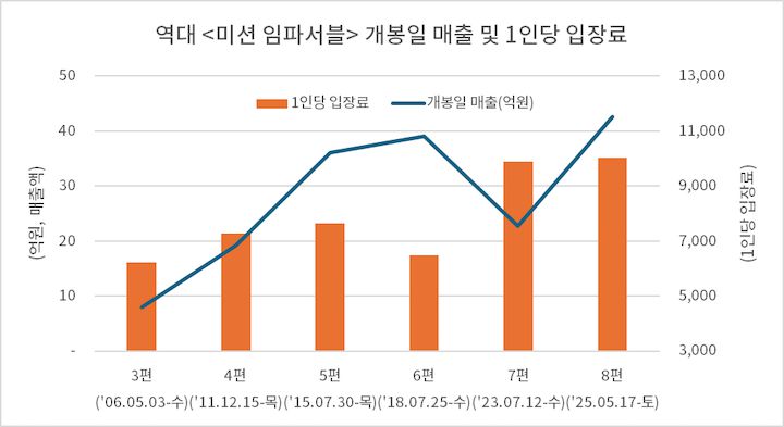 5월 17일 토요일 개봉한 시리즈 8편 '파이널 레코닝'은 첫날 42억5403만원의 매출을 올렸다. 이는 기존 최고 기록인 6편 '폴아웃'(2018년 7월 25일)의 39억0568만원을 넘어 역대 최고 기록이다.