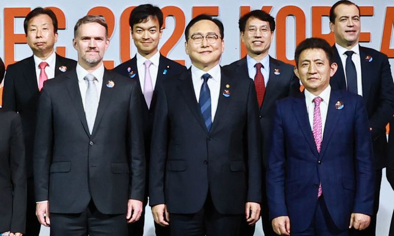 정인교 산업통상자원부 통상교섭본부장이 15일 제주 서귀포시 제주국제컨벤션센터에서 열린 '2025 APEC 통상장관회의'에서 제이미슨 그리어 미국 무역대표부 대표, 리 청강 중국 상무부 국제무역협상대표 겸 부부장 등 참석자들과 함께 기념촬영을 하고 있다. 산업통상자원부 제공 |