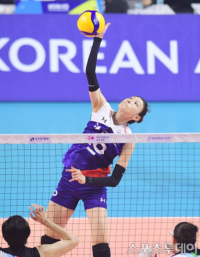 팀 스타 김연경이 스파이크를 날리고 있다.