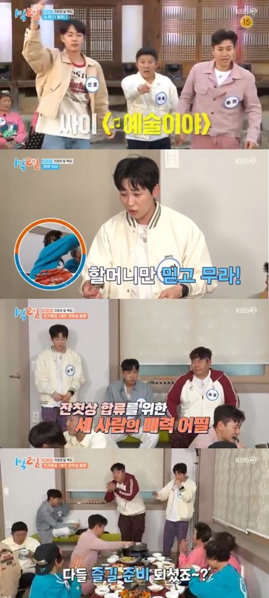 필선 팀의 김종민, 조세호, 유선호는 할머니들과 함께 꽃갈비 보양탕, 통갈치구이, 단호박오리찜, 랍스터구이, 로제파스타 등으로 차려진 밥상을 즐기게 됐다.