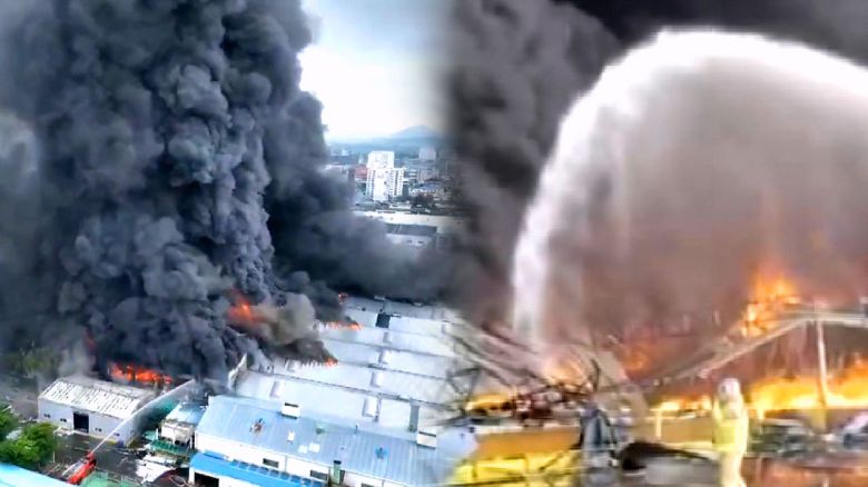 공장을 뒤덮은 새카만 연기가 높이 솟구칩니다.