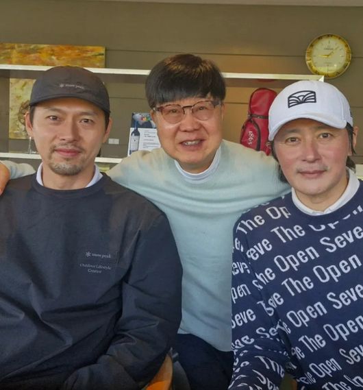 공개된 사진에는 임백천을 사이에 두고 현빈과 장동건이 나란히 앉아 포즈를 취하고 있는 가운데, 세 사람은 골프장에서 만난 듯한 배경 속에서 캐주얼한 차림으로 카메라를 바라보고 있다.