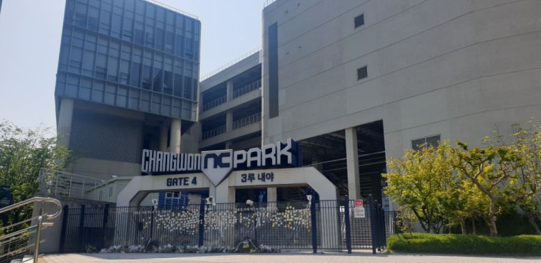 지난 14일 찾아간 경남 창원시 마산회원구에 있는 NC의 홈구장인 창원NC파크 앞. 구장 4번 게이트에는 추모객들이 적은 애도의 메모와 조화가 가득했다.