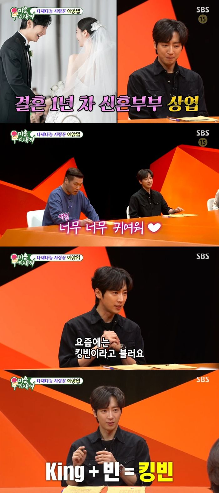 이상엽은 “요즘엔 킹빈이라고 불러요. 이름에 ‘빈’이 들어가는데 King이랑 같이 붙여요. 또 킹받게(열받게) 한다는 중의적인 의미도 있어서 킹빈이에요. 너무너무 귀여워 킹빈이”라며 아내와의 관계를 자랑했다.