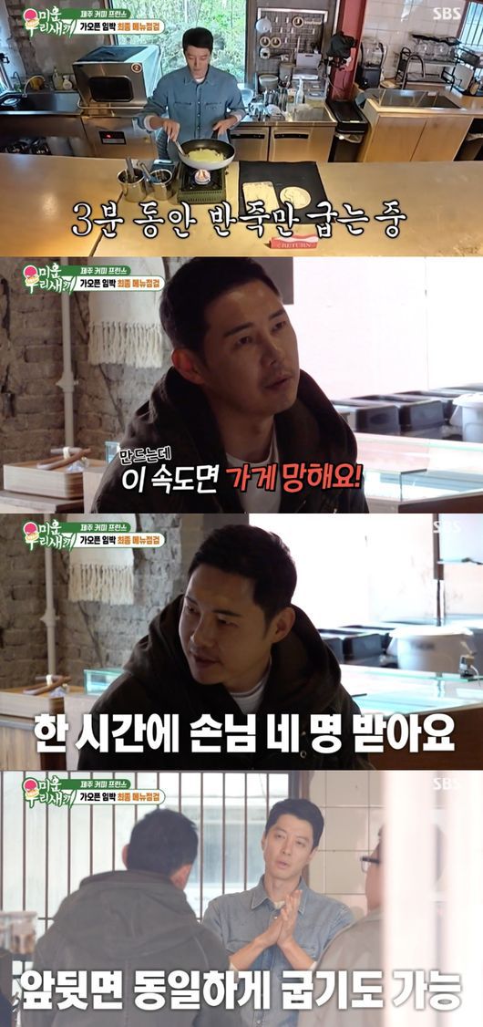 속도가 느린 게 가장 큰 문제라는 유정수는 “와플 기계 도입하시면 어떠냐. 피스타치오 팬케이크를 와플 기계로 풀어내는 거다. 와플기계의 가장 큰 장점은 누가 구워도 똑같이 구울 수 있다. 앞뒷면 동일하게 굽기도 가능하다. 뒤집을 때 형태가 망가지고 생기는 균열이 있는데 와플 기계는 반죽만 잘하면 골고루 익는다”라고 조언했다.