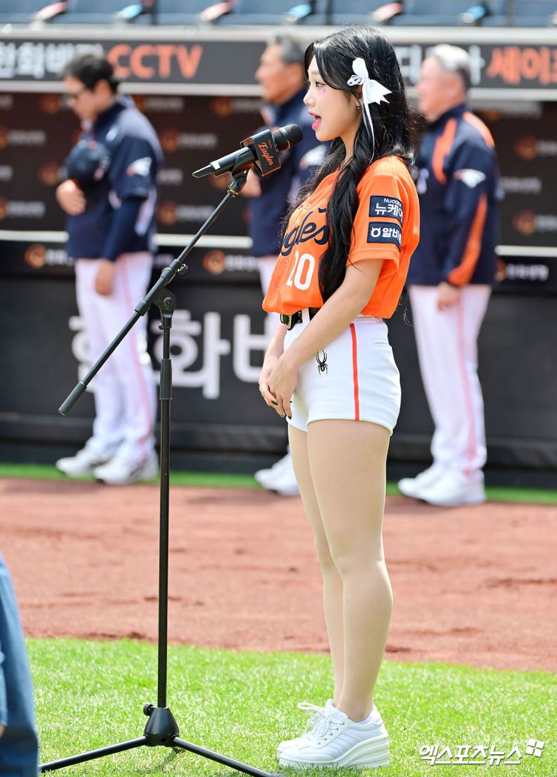 (엑스포츠뉴스 대전, 김한준 기자) 18일 오후 대전 한화생명 볼파크에서 열린 '2025 신한 SOL Bank KBO리그' SSG 랜더스와 한화 이글스의 경기, 경기 전 지아영 치어리더가 애국가를 제창하고 있다.