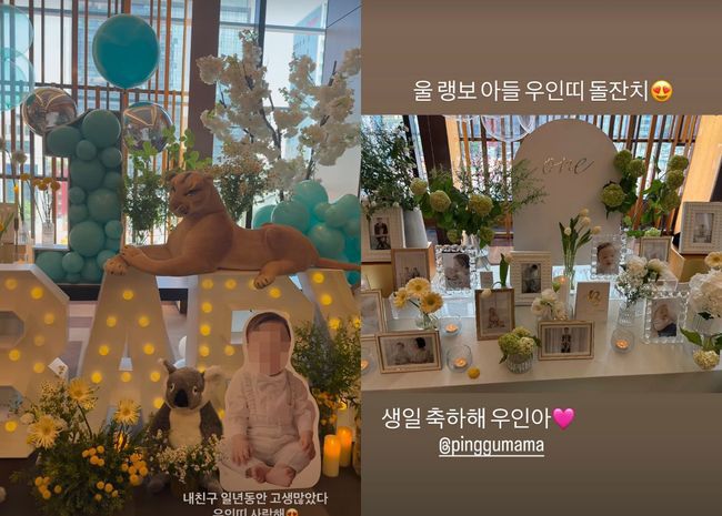 민트톤 풍선과 대형 조형물, 그리고 앙증맞은 인형 장식이 어우러졌고, 테이블 위에는 우인 군의 성장 과정을 담은 사진들이 액자마다 정성스럽게 배치돼 있었다.