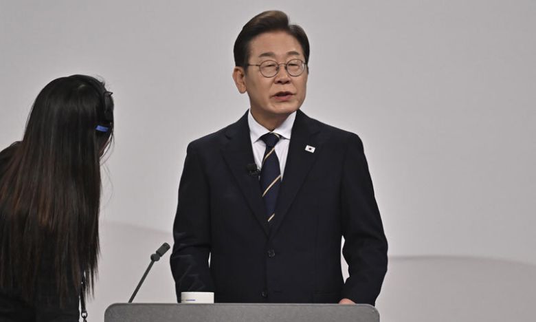 국민의힘 김문수(왼쪽부터), 민주노동당 권영국, 개혁신당 이준석, 더불어민주당 이재명 대선 후보가 중앙선거방송토론위원회 주관으로 서울 상암동 SBS 프리즘센터 스튜디오에서 18일 열린 제21대 대선 1차 후보자 토론회를 준비하고 있다. 국회사진기자단 |