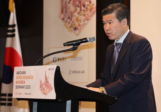 주한미국상공회의소 주최 국내 기업환경 세미나에서 인사말 하는 제임스 김 회장. [연합뉴스]
