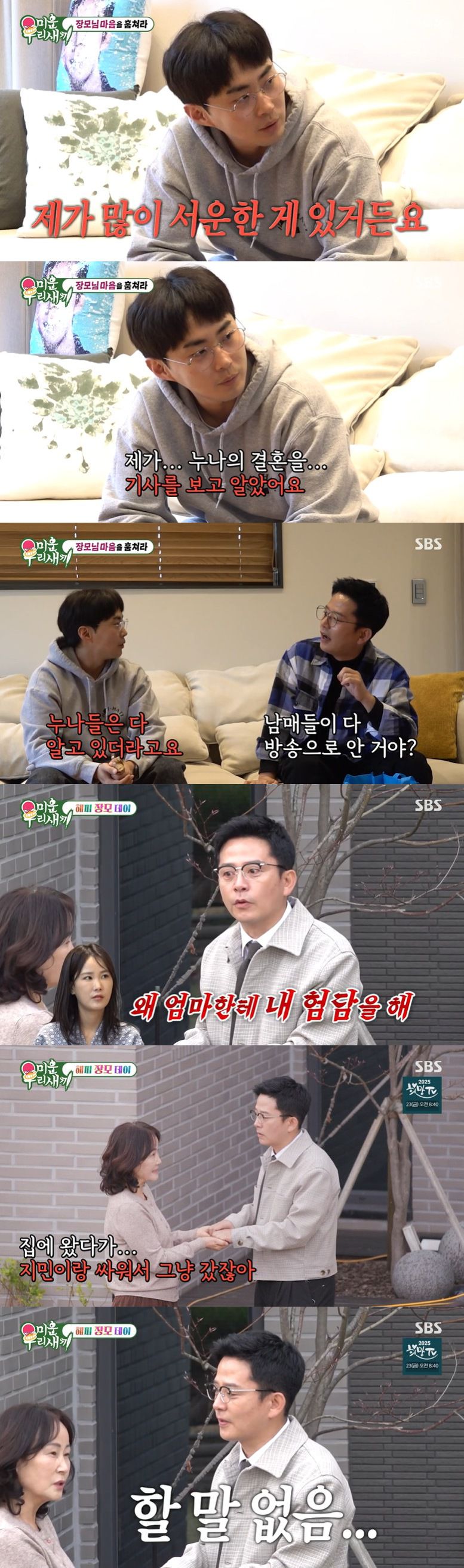 예비 처남은 "제가 누나의 결혼을 기사를 보고 알았다. '미우새' 보니까 7월 13일이라더라. 남매 단톡방이 있는데 누나들은 다 알고 있더라. 저는 가족인데"라며 서운함을 털어놨고, 김준호는 "미안하다"며 사과했다.