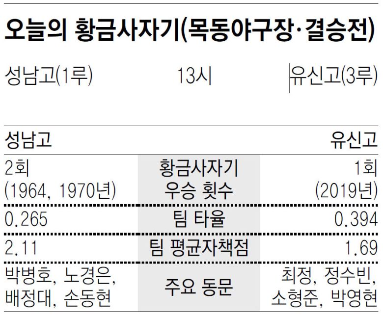 유신고와 성남고가 19일 오후 1시 서울 양천구 목동야구장에서 열리는 제79회 황금사자기 전국고교야구대회 겸 주말리그 왕중왕전 결승에서 맞붙는다. 17일 열린 준결승전에서 성남고는 물금고를 7-6(연장 10회), 유신고는 세광고를 3-1로 각각 제압했다. 두 팀이 황금사자기에서 맞붙는 건 2019년 대회 16강전(유신고 4-1 승) 이후 6년 만이다.