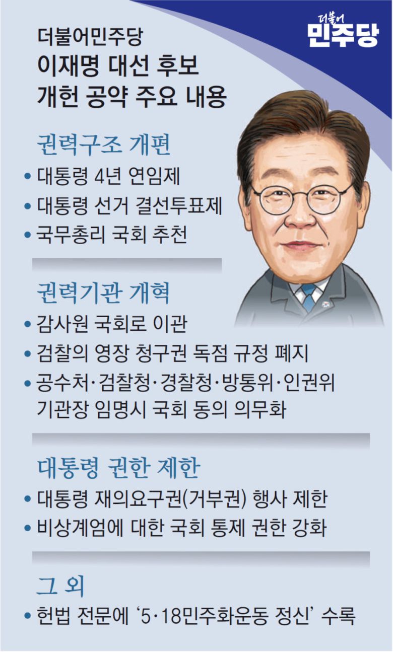 더불어민주당 이재명 대선 후보가 18일 밝힌 개헌 공약의 핵심은 대통령 4년 연임제와 대선 결선투표제, 국회의 국무총리 추천 등 권력구조 개편이다. 대통령의 인사권과 재의요구권(거부권) 등 권한을 축소하고 국회의 견제권을 강화해 권력을 분산하겠다는 것이다. 이 후보는 또 검찰의 영장 청구권 독점 규정 폐지 등 권력기관 개혁안도 내놨다.