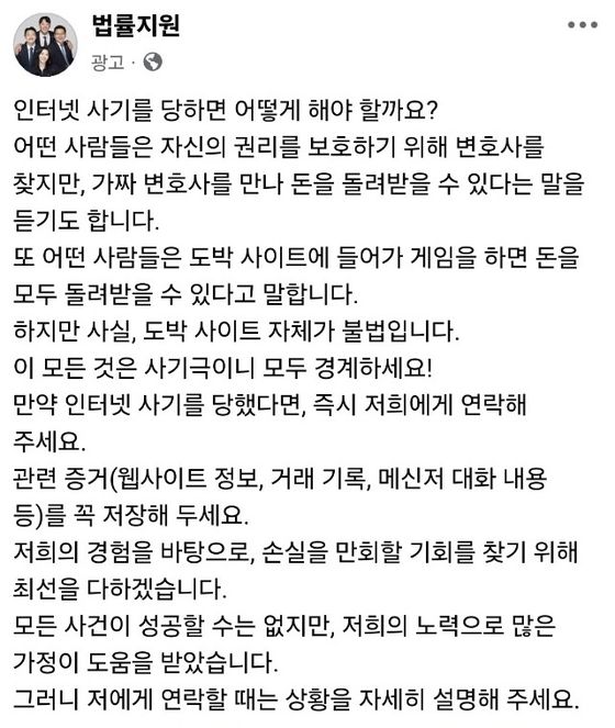 지난달 28일 경북 김천에 위치한 대한법률구조공단 본부에 “김민경 변호사가 있느냐”고 묻는 민원인 A씨가 방문했다. A씨는 앞서 사기를 당해 1억원의 피해를 본 상태에서 “법적 대응을 도와주겠다”는 페이스북 광고를 봤다고 했다. 광고에 등장하는 대한법률구조공단 소속 김민경 변호사라고 주장하는 사람에게 소송 비용 2600만원을 이체했지만 이후 연락이 끊겨 김천 본부까지 온 것이었다.