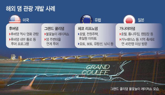 18일 아시아투데이 취재에 따르면 그랜드 쿨리댐에서는 컬럼비아강 댐 건설, 그리고 둑을 따라 살고 있는 인디언들의 이야기를 담고 있는 '하나의 강, 많은 목소리(One River, Many Voices)'라는 레이저쇼가 이뤄진다. 특히 댐 방문자센터를 따라 안내받을 수 있는 가이드 투어 등 레이저쇼와 함께 즐길 수 있는 콘텐츠들을 마련했다. 댐이라는 하드웨어적 관광자원에 지역의 역사성 등 콘텐츠 요소를 결합해 낸 사례로 손꼽힌다.
