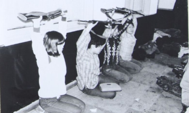 2019년 11월 당시 대안신당이 공개한 사진이다. 무릎을 꿇은 채 총을 들고 있는 4명 가운데 맨 오른쪽에 있는 여성이 ㅇ씨다. ㅇ씨는 1980년 5월 광주항쟁 마지막 날 계엄군에게 잡혀 전투교육사령부가 있던 상무대로 끌려가 성폭력을 당했다. 대안신당 제공