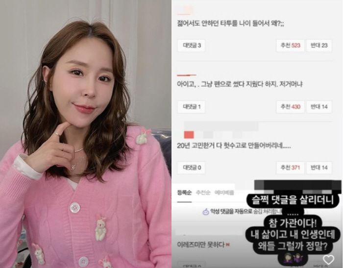신지가 공유한 댓글에는 "젊어서도 안 하던 타투를 나이 들어서 왜?", "그냥 펜으로 썼다 지웠다 하지. 저거 뭐냐" "20년 고민한거 다 헛수고로 만들어버리네" 등의 내용이 담겼다.