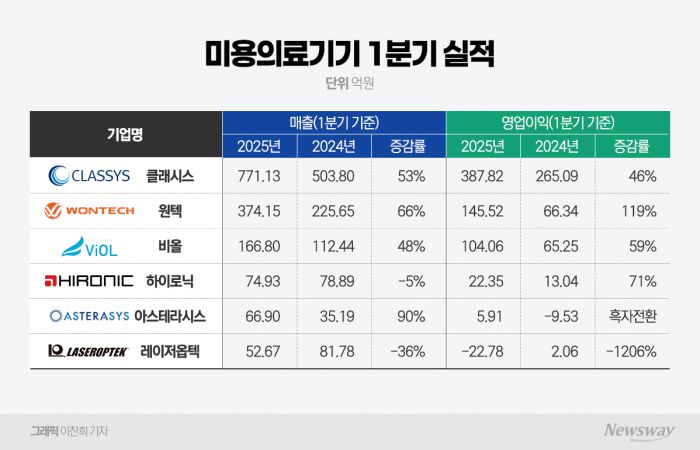 19일 업계에 따르면 주요 상장사 미용의료기기 기업 6곳(클래시스, 원텍, 비올, 하이로닉, 아스테라시스, 레이저옵텍) 중 4곳이 전년 대비 매출이 늘었다.